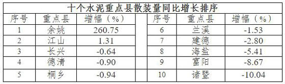 富阳、建德、余姚、海盐、桐乡、德清、长兴、诸暨、兰溪、江山十个水泥重点县(市、区)水泥产量6843.11万吨,占全省总量54.20%,占比提高0.51个百分点;散装水泥供应量6174.21万吨,占全省总量56.44%,占比提高2.09个百分点。详见下表: