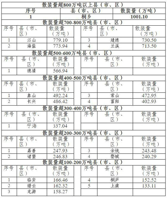 (2)散装量超千万吨的市和超百万吨的县(市、区)情况。列入散装量考核的8个设区市,除绍兴、丽水外,其余6市均超1000万吨,分别是嘉兴2221.50万吨、衢州1571.46万吨、杭州1467.54万吨、宁波1465.61万吨、湖州1431.05万吨、金华1003.42万吨。散装量同比增长率分别为:宁波6.37%、杭州2.07%、嘉兴-3.28%、衢州-3.58%、金华-6.30%、湖州-9.06%、绍兴-12.17%、丽水-18.46%。县(市、区)排名见下表: