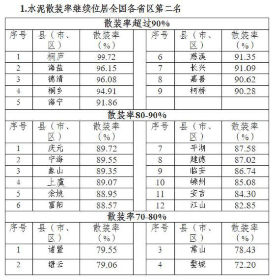 2023年,全省水泥散装率86.65%,同比提高0.77个百分点,超额完成水泥散装率86.00%的指导目标,继续位居全国各省区第二名。其中,列入散装率考核的8个设区市散装率依次为嘉兴93.96%、湖州93.00%、宁波90.06%、杭州88.51%、绍兴85.19%、丽水79.72%、衢州79.61%、金华70.31%;5县(市、区)排名见下表:
