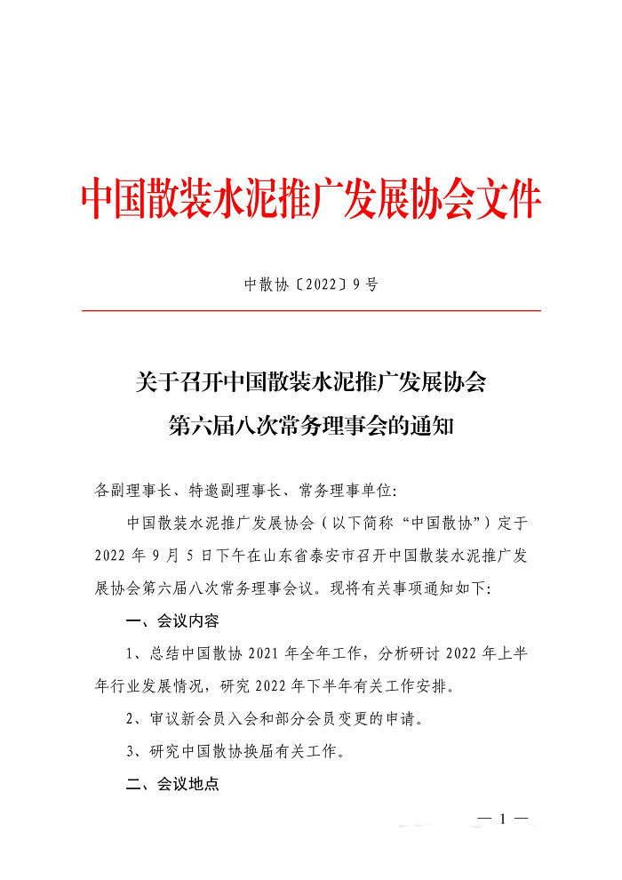 关于召开中国散装水泥推广发展协会第六届八次常务理事会的通知