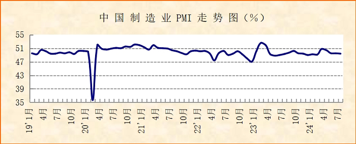 后市回升动力蓄积。7月份,尽管经济运行短期存在波动,但后市回升动力仍在蓄积,一是制造业企业原材料备货储存趋稳回升,采购量指数和原材料库存指数分别为48.8%和47.8%,较上月上升0.7个和0.2个百分点;二是制造业企业吸纳就业人数趋稳回升,从业人员指数为48.3%,较上月上升0.2个百分点,创2023年6月以来新高;三是制造业企业对后市仍保持乐观预期,生产经营活动预期指数仍运行在53%以上的较好水平。综合来看,当前企业正在夯实运行基础,随着各项稳经济扩内需政策继续落实以及高温多雨天气影响消退,市场需求将较快释放,企业生产活动加快上升,经济景气趋稳回升。