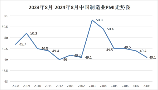 中国物流与采购联合会、国家统计局服务业调查中心发布的2024年8月份中国制造业采购经理指数(PMI)为49.1%,比上月下降0.3个百分点。
