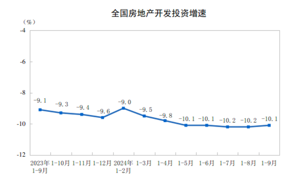 1—9月份,全国房地产开发投资78680亿元,同比下降10.1%;其中,住宅投资59701亿元,下降10.5%。