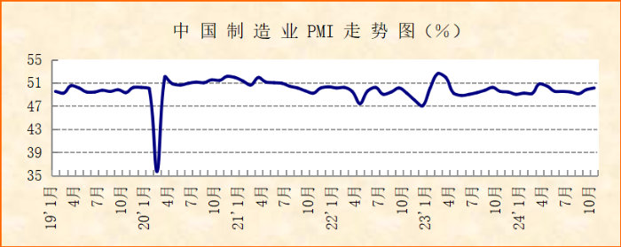 中国物流与采购联合会、国家统计局服务业调查中心发布的2024年10月份中国制造业采购经理指数(PMI)为50.1%,较上月上升0.3个百分点,连续2个月上升,且在连续5个月运行在50%以下后回到景气区间。分项指数普遍上升,显示当前经济运行积极变化明显,市场需求改善,生产加快,上下游市场价格联动回升,基础原材料行业止降回稳,新动能保持平稳增长,企业预期乐观,经济向好回升基础继续巩固。