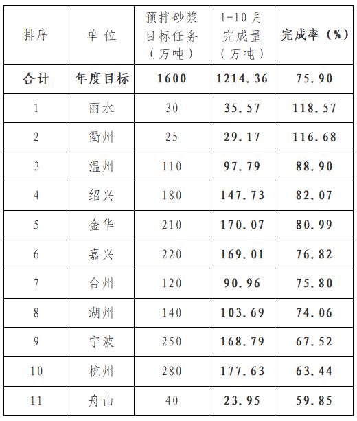 2.预拌砂浆目标任务。1-10月,全省11个市预拌砂浆量按二类指导目标1600万吨计,完成率为75.90%。具体情况如下: