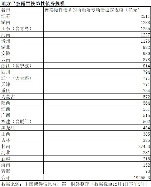 根据中国债券信息网数据统计发现,自11月9日财政部将6万亿元新增地方政府债务限额下达至各省份后,截至12月11日,地方将完成发行合计约1.93万亿元地方政府再融资专项债券,用于置换存量隐性债务。