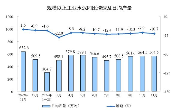 11月份,全国单月水泥产量16934万吨,同比下降10.7%;1—11月份水泥产量167068万吨,同比下降10.1%。