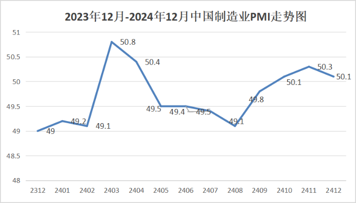中国物流与采购联合会、国家统计局服务业调查中心发布的2024年12月份中国制造业采购经理指数(PMI)为50.1%,比上月下降0.2个百分点。