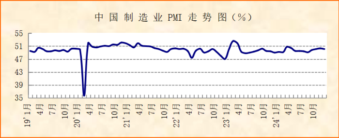 中国物流与采购联合会、国家统计局服务业调查中心发布的2024年12月份中国制造业采购经理指数(PMI)为50.1%,较上月小幅下降0.2个百分点,但连续3个月稳定在扩张区间。分项指数变化显示,市场需求稳定加快恢复,企业生产保持较好增长,大型企业稳中有增,中型企业稳定恢复。整体来看,12月经济平稳收官,四季度趋稳回升,并集聚了多个积极趋势,为新年经济良好开局奠定了基础。