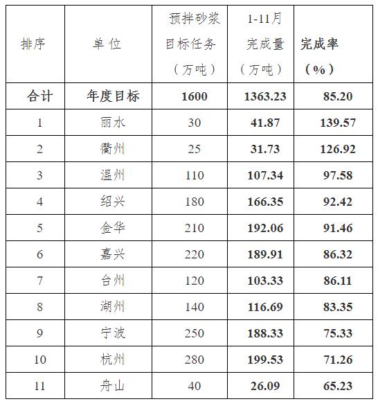 2.预拌砂浆目标任务完成情况。1-11月,全省11个地市预拌砂浆产量按二类指导目标1600万吨计,完成率为85.20%,预计完成年度考核目标有难度。完成情况如下: