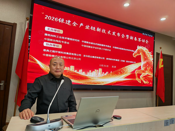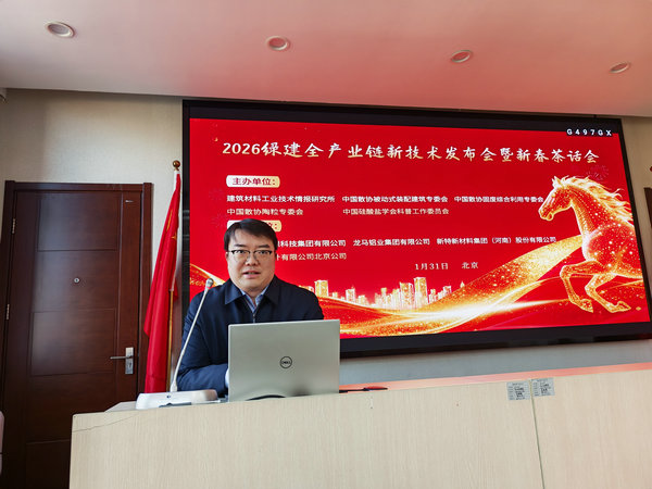 2026年1月31日由建筑材料工业技术情报研究所、中国散装水泥推广发展协会固废综合利用专业委员会((以下简称“中国散协固废综合利用专委会”))、中国散协被动式装配建筑专委会、中国散协陶粒专委会、中国硅酸盐学会科普工作委员会共同主办,青岛恩典之路环保有限公司、龙马铝业集团有限公司、新特新材料集团(河南)股份有限公司、中塍勘察设计有限公司北京公司等单位协办的“2026绿建全产业链新技术发布会暨新春茶话会在北京召开”。