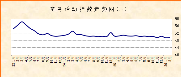 国家统计局服务业调查中心、中国物流与采购联合会发布的2026年2月份中国非制造业商务活动指数为49.5%,较上月上升0.1个百分点,连续2个月运行在50%以下,意味着非制造业景气水平与上月波动不大,但整体水平仍待提升。分行业看,建筑业延续淡季特征,景气水平有所下降,服务业景气水平较上月小幅上升。