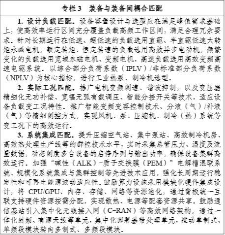 (九)强化装备与装备间耦合匹配。探索建立节能装备在实际变负荷运行工况下的宽域高效性能评价体系,推动实现节能装备与其负载设备、运行工况、用能系统(含辅机设备等)的精准匹配,减少驱动与负载之间的容量、结构、接口冗余,避免“大马拉小车”等情况。提升电机与其变速、传动、负载等设备的匹配水平,鼓励风机、泵、压缩机和工业热泵采用变频调速等技术开展匹配性改造升级。鼓励算力设施、通信基站引入一体化、模块化供电系统部署和集中散热架构,推动主设备与辅助设备采用统一接口标准实现系统集成,实现网络设备和终端设备节能特性协同,构建端网协同、双向赋能的绿色网络。