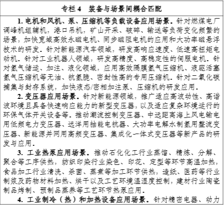 (十)强化装备与场景间耦合匹配。面向重点用能行业、新兴产业的发展需求,开发场景适配的关键节能装备和一体化系统解决方案。针对可再生能源发电、新能源汽车、大规模氢气制取和储运、航空航天、生物医药、二氧化碳捕集与封存等新兴应用场景,开发专用节能装备。针对自然冷源、风光资源丰富地区,鼓励建设自然冷却系统、可再生能源发电等,提升信息通信基础设施绿色发展水平。针对热力系统低碳、零碳需求,突破长距离低成本输热、跨季节大规模储热和热电协同等技术,支撑电力系统削峰填谷和绿电消纳。