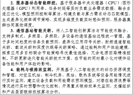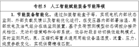 (十三)推进人工智能赋能节能装备应用。推动节能装备与智能平台一体化协同,以数字化能碳管理中心、大数据平台等为基础,实现硬件提供感知与执行载体、软件优化节能策略的联动。融合人工智能、5G、工业互联网等技术,推进节能装备关联系统联合调优,促进一体化智能运维管理。聚焦大模型训练等新型高能耗应用场景,应用多目标寻优等算法,实现基于业务场景的最佳节能策略动态匹配。推动能源消耗和碳排放数据的精准化计量、精细化管控、智能化决策。推广基于标识解析的节能装备信息化与节能统计平台,实现装备运行情况智能化统计监测。