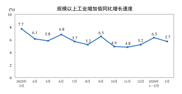 3月份,规模以上工业增加值同比实际增长5.7%(增加值增速均为扣除价格因素的实际增长率)。从环比看,3月份,规模以上工业增加值比上月增长0.28%。1—3月份,规模以上工业增加值同比增长6.1%。