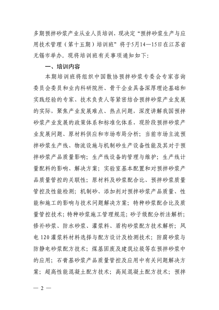 关于举办预拌砂浆生产与应用技术管理(第十五期·无锡)培训班的通知(第一轮)